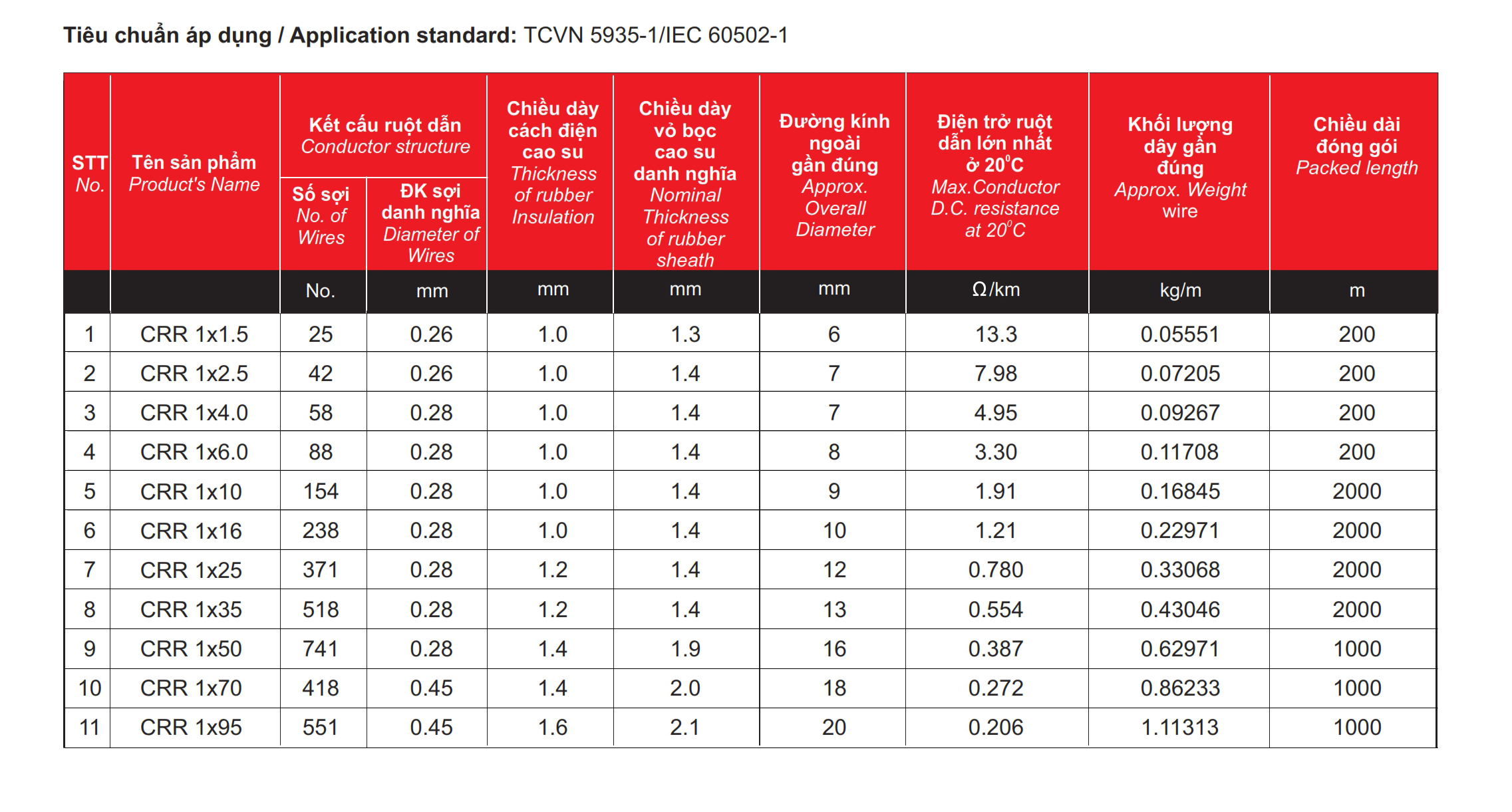 - Vật liệu cách điện và vỏ bọc: Cao su gốc tự nhiên.