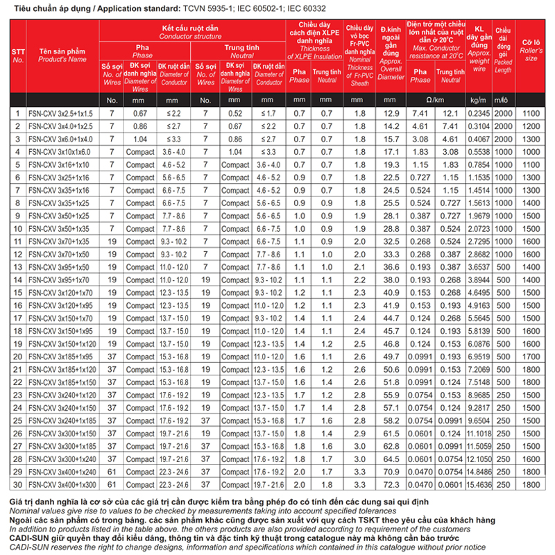 - Quy cách: Cu/XLPE/Fr-PVC