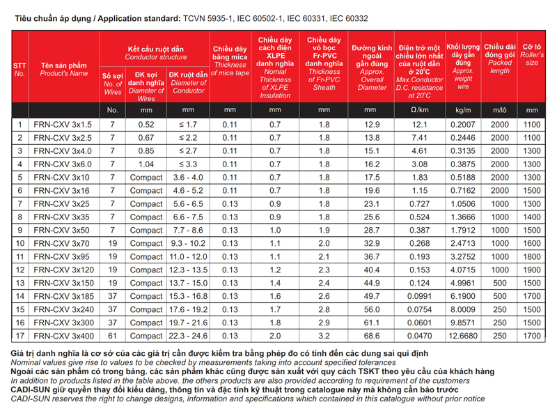- Quy cách: Cu/Mica/XLPE/Fr-PVC